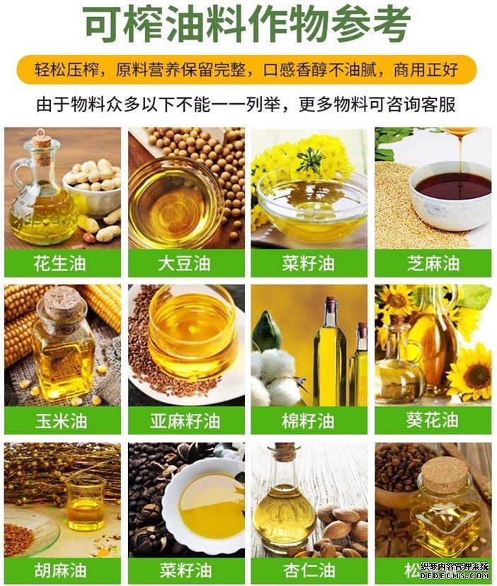 該設(shè)備可適用于菜籽、花生、茶籽、大豆、核桃、葵花籽等油料的生產(chǎn)加工,且壓榨出的油品綠色環(huán)保,對(duì)人體健康有益無(wú)害。購(gòu)買(mǎi)此機(jī)后可長(zhǎng)期穩(wěn)定作業(yè),對(duì)于中、小油廠和鄉(xiāng)鎮(zhèn)個(gè)體企業(yè)都很適用。